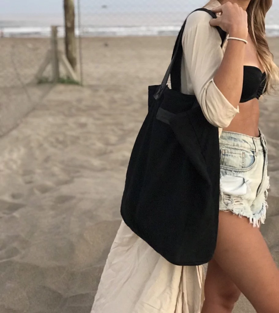 Cartera realizada en canvas de algodón teñido artesanalmente con las alzas en cuero .Un bolsillo interior colgante íntegramente en cuero con cierre